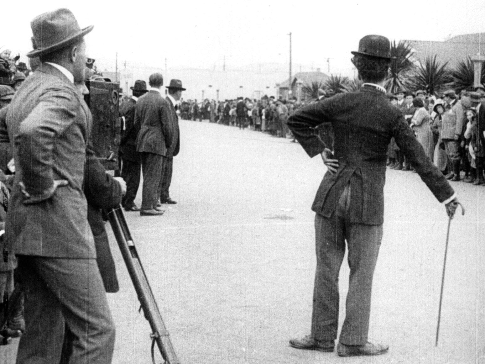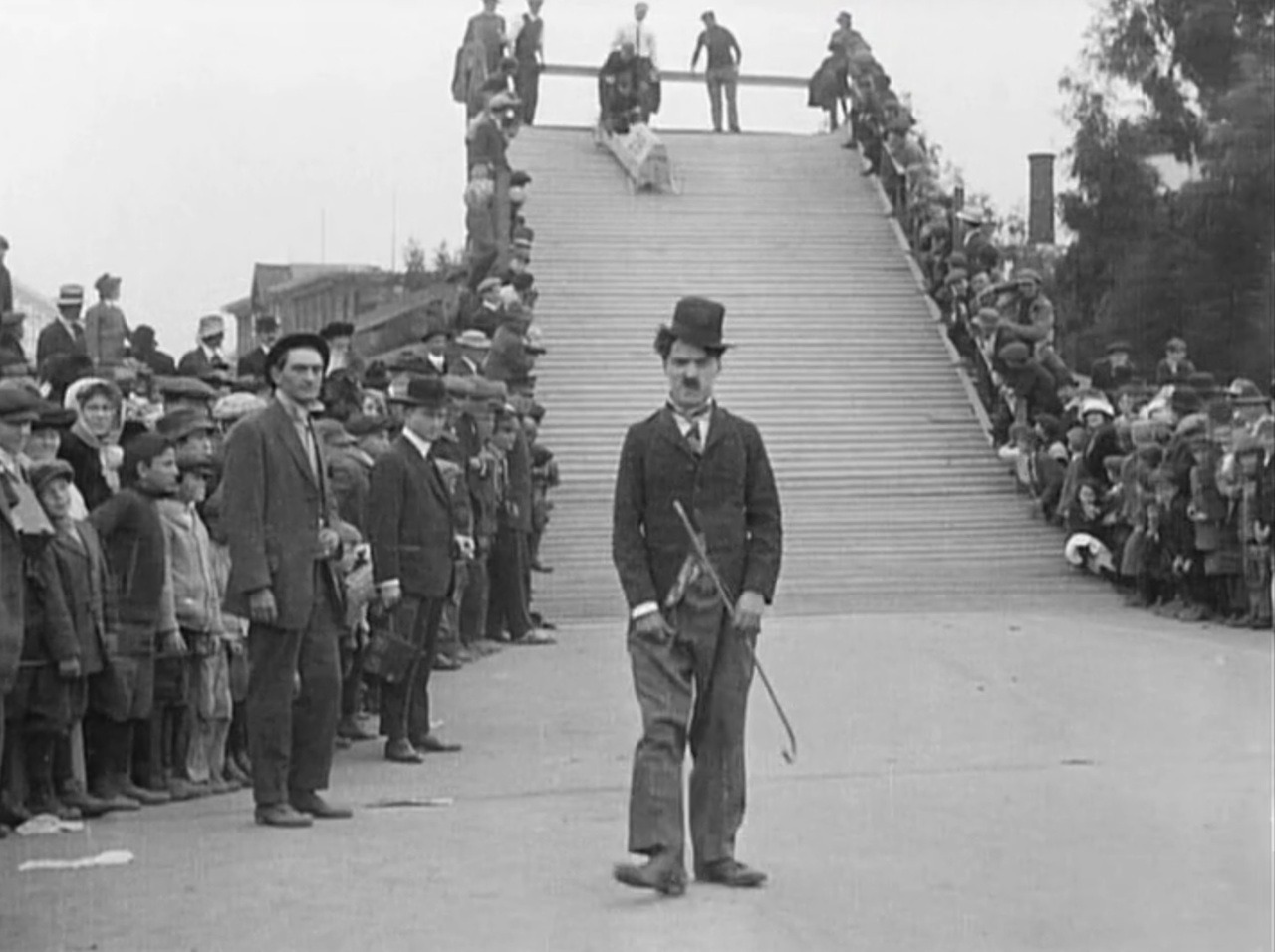 <Story>カリフォルニア州のヴェニスで開催中の子供自動車レース。コースの脇ではカメラマンがレースの様子を撮影している。そこに登場したのは目立ちたがり屋の浮浪者。カメラの前に現れては撮影の邪魔をし…。チャップリンの出演2作目の映画。いわゆるチャップリンの扮装(チョビ髭、山高帽、ダブダブのズボン…)が、初めてスクリーンに登場した記念すべき作品でもある。